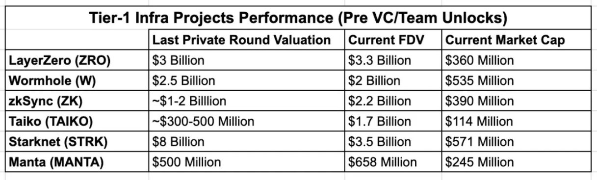 基础设施泡沫已经开始破裂,本轮周期中许多基础设施项目发行的代币已经低于私募轮估值。随着未来 6-12 个月内出现重大解锁,风险投资公司将陷入困境,这将是一场「跑得快」游戏。