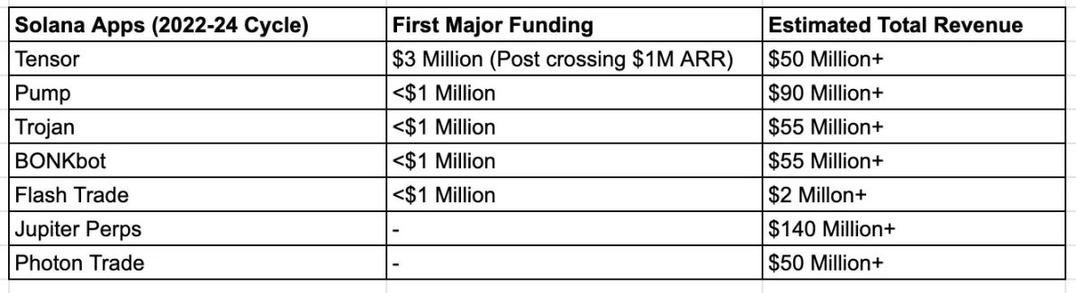 而 Solana 上的应用不需要过多关注基础设施,基础设施由一些可靠的 Solana 基础设施初创公司(如 Helius / Jito / Triton 或协议集成)负责。一般来说,应用不需要足太多的资金即可启动,比如 Uniswap、Pump/fun 和 Polymarket。