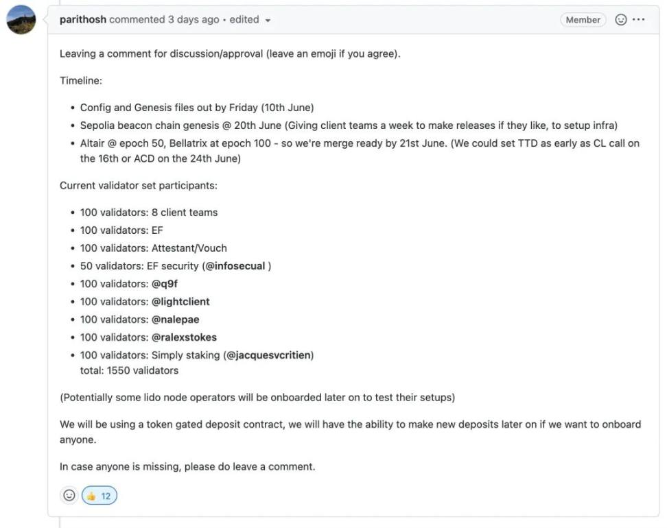 如果是决定先进行 Sepolia 合并,时间安排大概是 Sepolia 信标链于 6 月 20 日创世,6 月 21 日进行合并 (在 6 月 16 日的共识层会议或 24 日的 ACD 上设 TTD)。其具体配置如下: