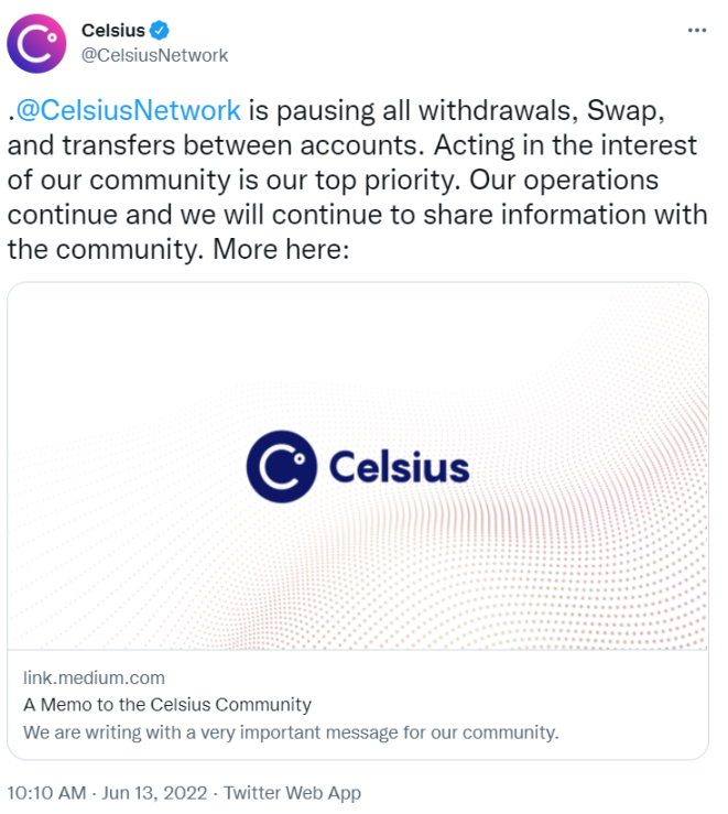 ➤ Celsius 宣布停止提款、兑换、账户转账功能