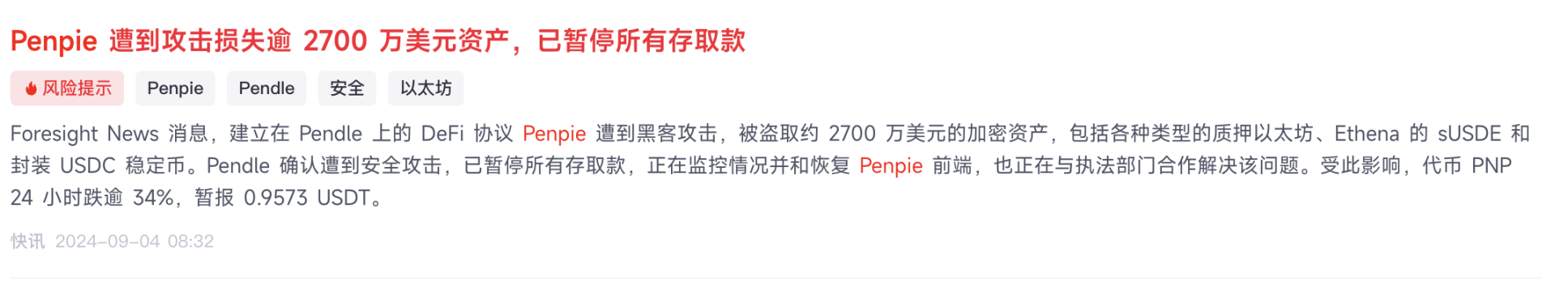9 月 4 日,建立在 Pendle 上的 DeFi 协议 Penpie 遭到黑客攻击,被盗取约 2700 万美元的加密资产,包括各种类型的质押以太坊、Ethena 的 sUSDE 和封装 USDC 稳定币。这是据 Certik 统计,2024 年发生的最大重入攻击,也是自 2021 年 1 月以来第三大重入攻击,仅次于 Grim Finance(约 4000 万美元,2021 年 12 月)和 Vyper 漏洞事件(约 5200 万美元,2023 年 7 月)。