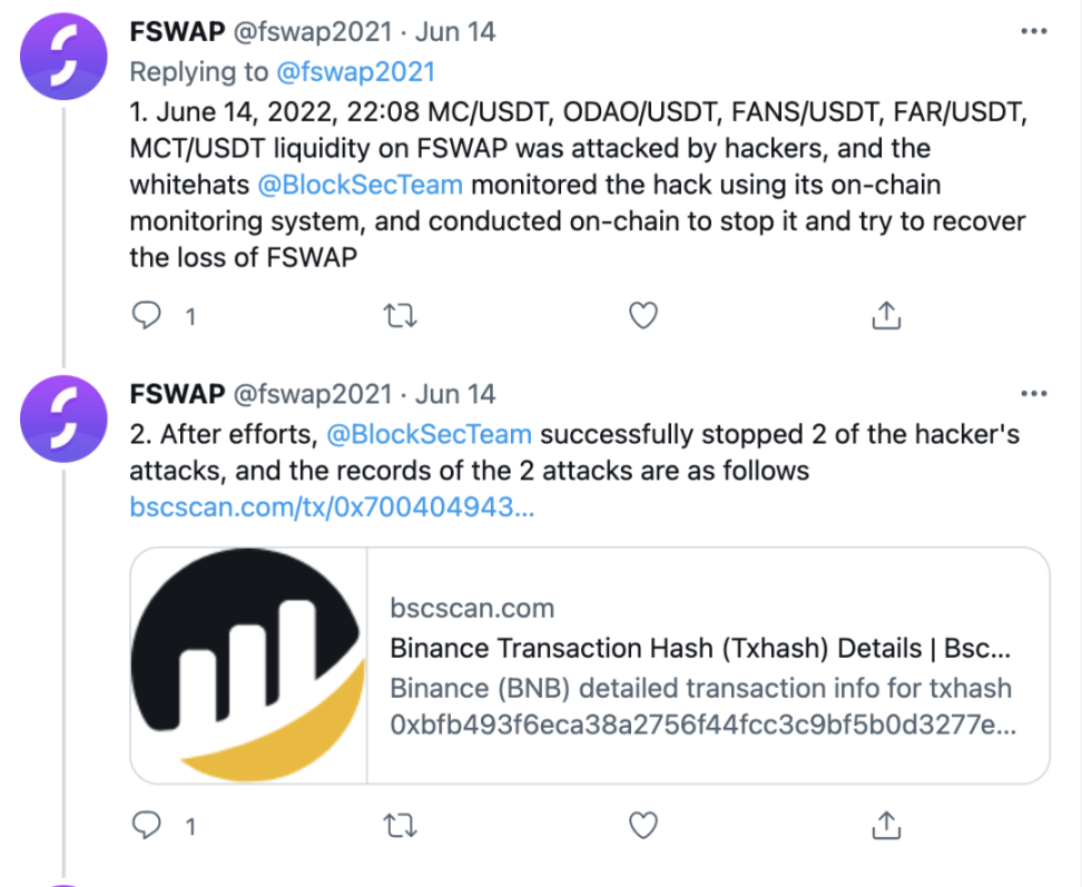 北京时间2022年6月13日晚,FSWAP项目遭受黑客攻击,黑客通过操纵DEX的pool中资产比例获利。黑客共计发动三笔攻击,BlockSec成功阻断拦截了其中2笔攻击交易,帮助项目方挽回大约3500 WBNB。目前BlockSec正在同项目方联系归还拦截资金。