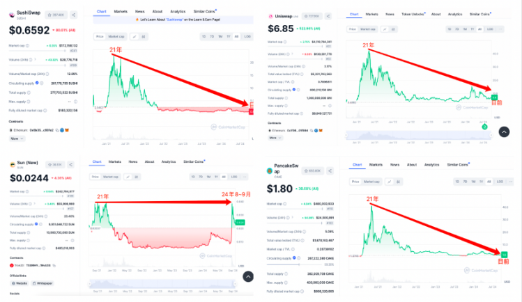 UniSwap、PancakeSwap、SushiSwap、Sun.io 都是市值和交易量都比较大的 DEX 平台,也一直都在发展,社媒在更新,社区在维护,版本在迭代,合作在发展。但币价却一路向下,颓势难救。