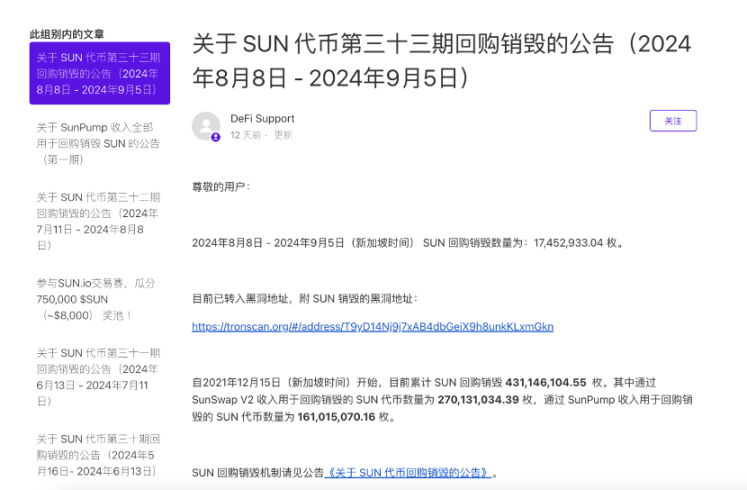 官方公告显示,从 9 月 4 日起,SunPump 产生的全部收入已用于回购和销毁 SUN,总计销毁数量达 161,015,070.16 枚。