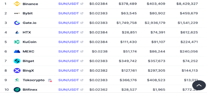 除 SunPump 赋能外,SUN 交易量显著提升也和全球各大 Top 交易所均已收录和支持 SUN 交易有关。目前,全球 Top10 交易平台均已支持 SUN 的交易。