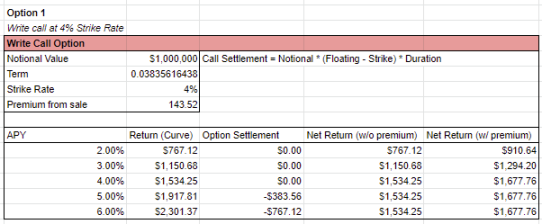 卖出看涨期权将APY的上半部分固定在你选择的行权利率上。如果你相信APY是稳定的(即当前的浮动利率=结算时的浮动利率),或者APY会随着期权在OTM到期而减少,而你仍然可以赚取期权溢价,那么这个策略是很好的。