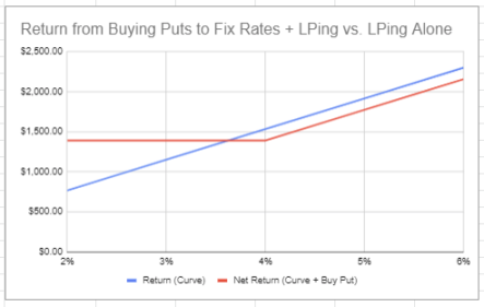 由于我们购买的看跌期权的名义值与LP金额相同,所以我们可以将LP金额与名义值相等。当我们将这两个方程相加并展开括号时,我们收到的净额应为: