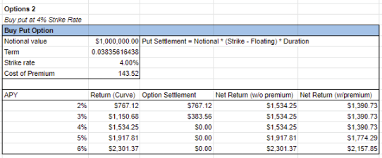 作为看跌IRO买家,如果行权利率高于浮动利率,到期日期权将会是ITM(价内)。如果你LP了100万美元,可以通过购买名义值相等金额的期权的看跌期权来固定池子偏低的利率。