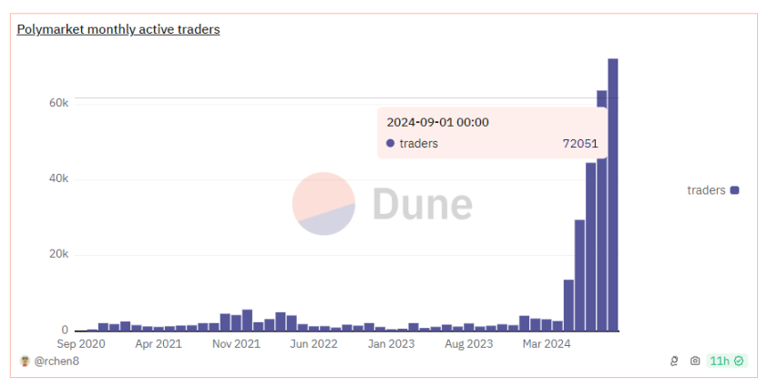 According to Dune Analytics, in August 2024, Polymarket reached a record monthly trading volume of $472 million, and as of September 26, 2024, its monthly trading volume was $446 million. In comparison, the trading volume in the same period in 2023 was only $73 million, reflecting the platform’s significant growth. Additionally, the platform’s daily active users reached 72,000 in September 2024, demonstrating a marked increase in user participation.