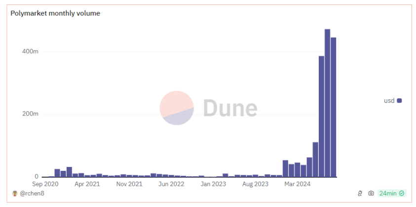 Since its launch in 2020, Polymarket rapidly developed into a leading platform in the crypto prediction market space, especially during major global political events, where its user base and trading volumes have surged. During the 2024 U.S. presidential election, Polymarket reached its peak in trading volume, with widespread betting on election results, vote distributions, and other markets.