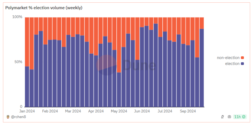 Political events are one of the most popular market types on Polymarket, especially during significant political events such as elections, where trading volumes typically peak. During the 2024 U.S. presidential election, Polymarket saw a significant rise in trading volumes, with total trading volume exceeding $1 billion. Users could predict not only the election winner, but also the results in specific states, the vote percentage of a particular candidate, etc. According to Dune data, the U.S. presidential election predictions contributed about 87% of Polymarket’s trading volume.
