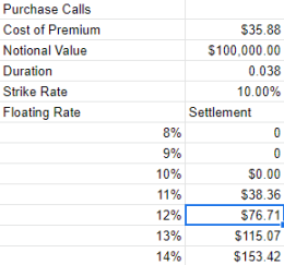 下表展示的是不同的行权利率的潜在 PnL。如果到期时利率为 12%,你的收益为 76.71$,投入成本 35.88$,收益率为 (76.71/35.88)*100 = 213.79%,而利率只增加了 2%。