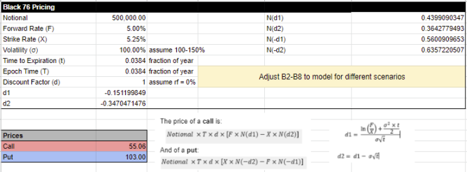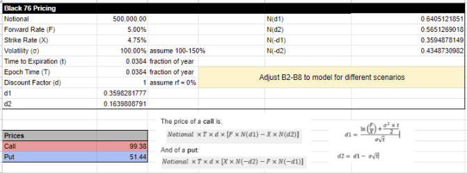 下图的模型显示了假设远期利率为 5% 的情况下,一个以 5.25% 的行权利率卖出的为期两周的看涨期权的名义价值为 $500k。