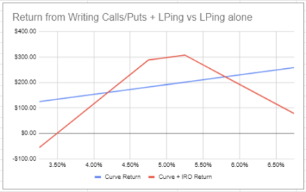 虽然该策略确实说只需在 Curve 中存入 $99k ,但当您将 $1k 存入 IRO SSOV 时,标的资产仍能赚取 Curve APY。这意味着使用我们的策略($99k Curve + $1k IRO SSOV)与仅使用 Curve 的 LPing 相比,能够从 Curve 存款中获得相同的收益。