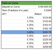 这个漂亮的模型用 10 万美元概述了您从Curve 上的 LPing 获得的回报,蓝色行突出显示 APY 保持在最初 5% 不变的情况下您所获得的收入。
