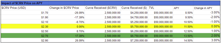 采用初始$CRV价格为$2.30时,池子会获得11.50%的APY