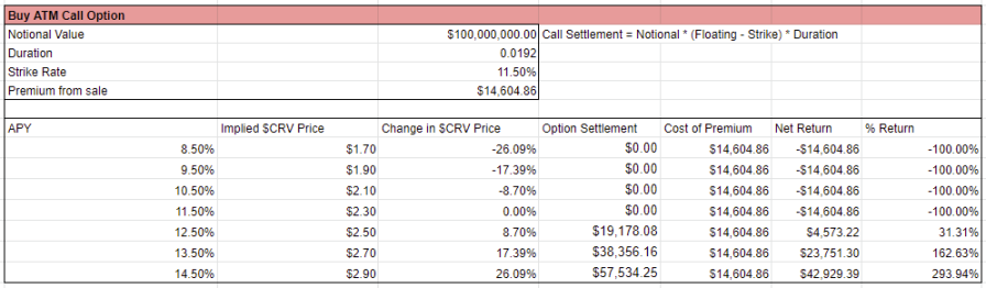 我们不会直接持有$CRV以从价格上涨中获益,而是购买看涨期权,如果浮动利率超过您选择的执行利率,您将从中获得结算收入。