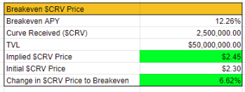 考虑到盈亏平衡APY为12.26%,盈亏平衡所需的隐含CRV价格为2.45美元。考虑到与初始价格2.30美元相比的百分比变化,$CRV价格必须增加6.62%才能实现收支平衡。