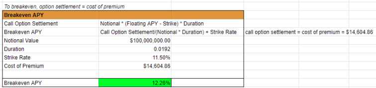 以平衡溢价的成本,你的看涨期权结算所需的APY为12.26%。这意味着在本例中APY必须增加0.76%才能达到收支平衡。