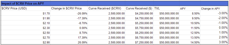 我们还将假设影响池子APY的唯一输入是$CRV的价格。$CRV价格变化对APY的影响可以在这里看到。