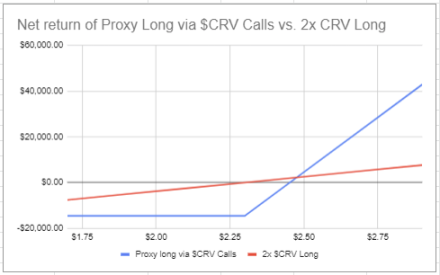 这张精美的图表可以将收益比较可视化表达出最好的效果,图中绘制了基于$CRV价格,使用看涨IRO来代理多头仓位与标准的2倍杠杆多头仓位的净回报!