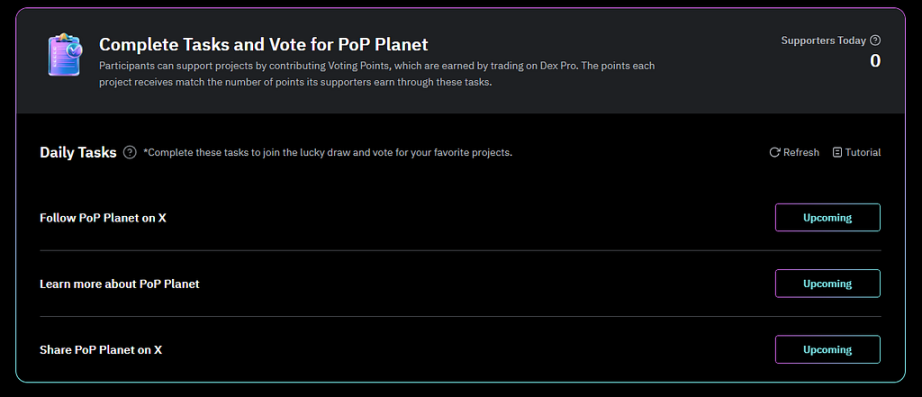 Participants can support projects by contributing Voting Points, which are earned by trading on Dex Pro. The points each project receives match the number of points its supporters earn through these tasks.