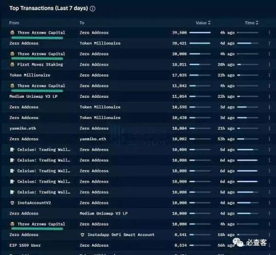 三箭曾作为 Luna 的主要背书机构,在 UST 崩盘期间也遭受了巨大的损失,而过去一个月 Bitfinex 的亏损排行里三箭也一直榜上有名。此次 stETH 脱锚和抛售中,三箭的「活跃程度」更是远超 Celsius,为了还债大量抛售 stETH。