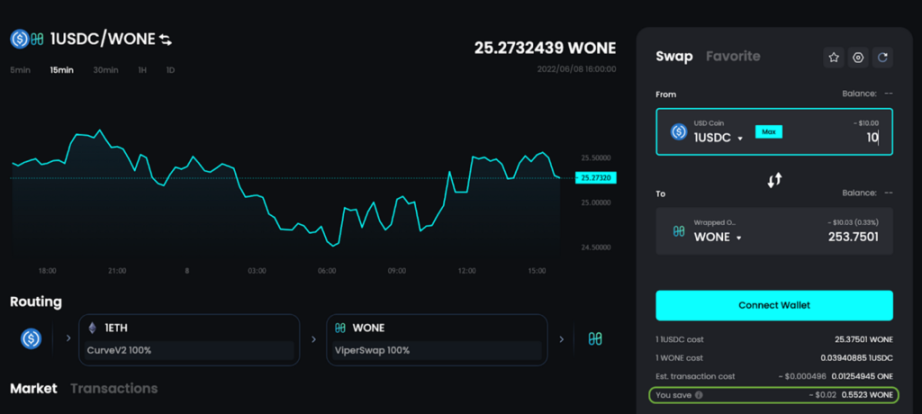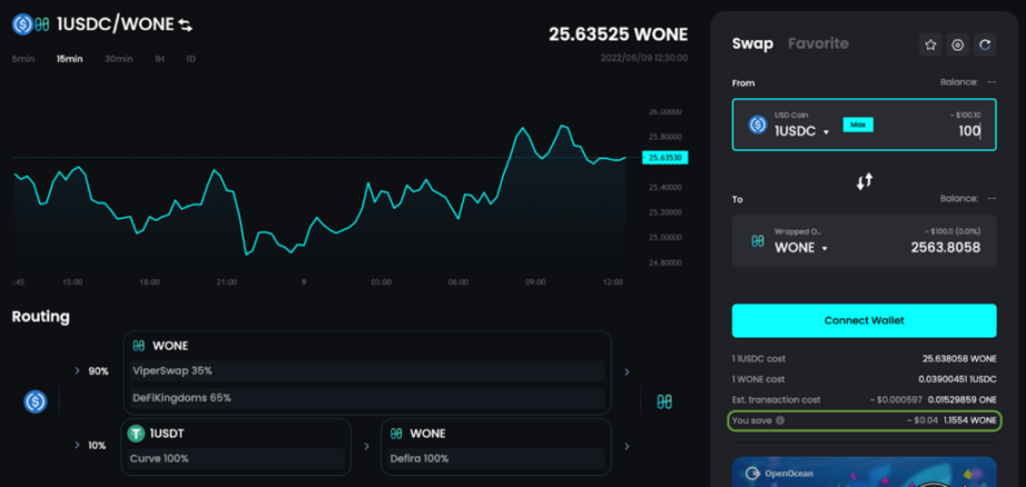 Swap 10 $1USDC to $WONE on OpenOcean; users get an extra $0.02 from OpenOcean compared with using any DEX directly.