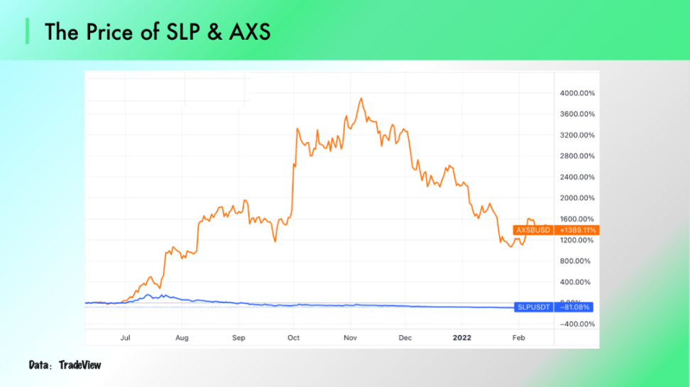 NFT 过度超发,收益通证贬值:去中心化游戏与传统网游不同,游戏角色的使用权和所有权均属于用户,游戏发展与用户的权益高度绑定,实际上,玩家花费 ETH 购买游戏角色入场的那一刻,就承担了游戏中的最重要风险(NFT资产的风险敞口)。在没有外部资金流入的条件下,回本周期与NFT / Reward Token 保值无法同时实现。当游戏角色( NFT )被首次发售时,极短的回本周期让参与者疯狂加价抢购,随着 NFT 价格被炒高,会使得用户进入游戏的门槛提高并且回本周期被拉长,这会严重妨碍用户增长。项目方将会采用增加或者促进 NFT 繁殖的方式来降低 NFT 的价格。如果开发者希望保证游戏的回本周期,每次 NFT 价格冲高之后,都会使得繁殖通证和NFT的供给增加,由此造成 NFT 与 Reward Token过度超发。以 Axie Infinity 为例 ,Reward Token (SLP)的价格表现相对于Governance Token(AXS)非常弱势。