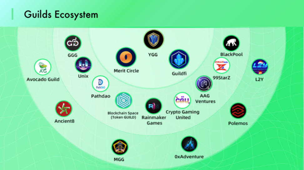 在 Play to Earn的 游戏生态系统中,Guilds 扮演着游戏做市商的职能。直接来说,公会是链游的流动性来源,游戏有了Guilds,才有了稳定的用户、活跃的NFT成交、代币交易的最初需求。更重要的是,它可以做市场宣传、招募玩家、培训用户、以及为那些没有足够本金购买游戏角色的玩家提供租赁服务,因此在 GameFi 的行业生态中具备十分重要的意义。