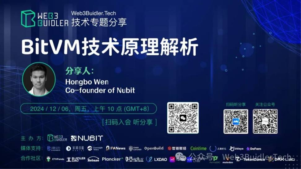 本周的 Web3BuidlerTech 技术专题分享,我们邀请到 Nubit 的联合创始人 Hongbo Wen 为我们带来分享:BitVM 技术原理解析。本次分享将涵盖你想要了解的关于 BitVM 的一切,从基础原理到实际应用和未来方向。
