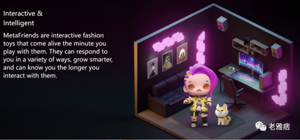 MetaFriends的另一大亮点是被赋予了人工智能属性,基于这个特性,它们不再只是一张静态图片或按照既定程序运行的3D动画,更是一个可以交流互动的智能玩伴。值得一提的是,MetaFriends NFT还被赋予了一定的学习能力,其在与持有者不断的交流学习中,智能程度会与日俱增,不仅会模拟持有者的互动方式,而且会逐步进化出与持有者相契合的个性。
