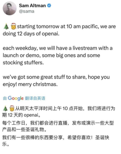 对于擅长“搞钱搞事情”的奥特曼来说,2024 年底最重要的,莫过于 OpenAI 在圣诞节前夕为期 12 天的产品发布会。