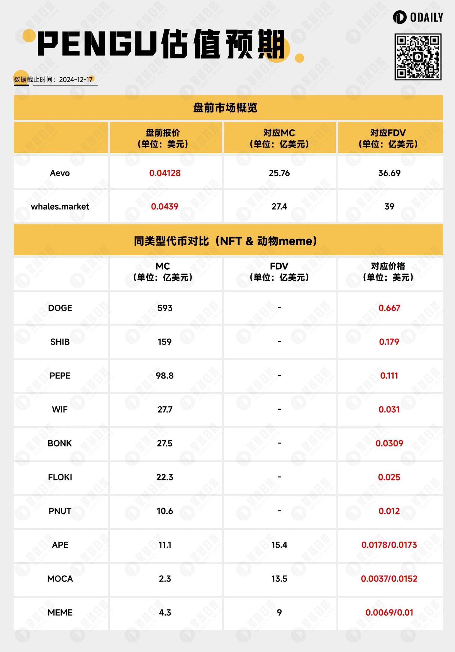 如果用 APE、MOCA 等 NFT 系代币,以及 PEPE、WIF 等动物系 meme 代币作为参考标的,PENGU 的估值预期如下。