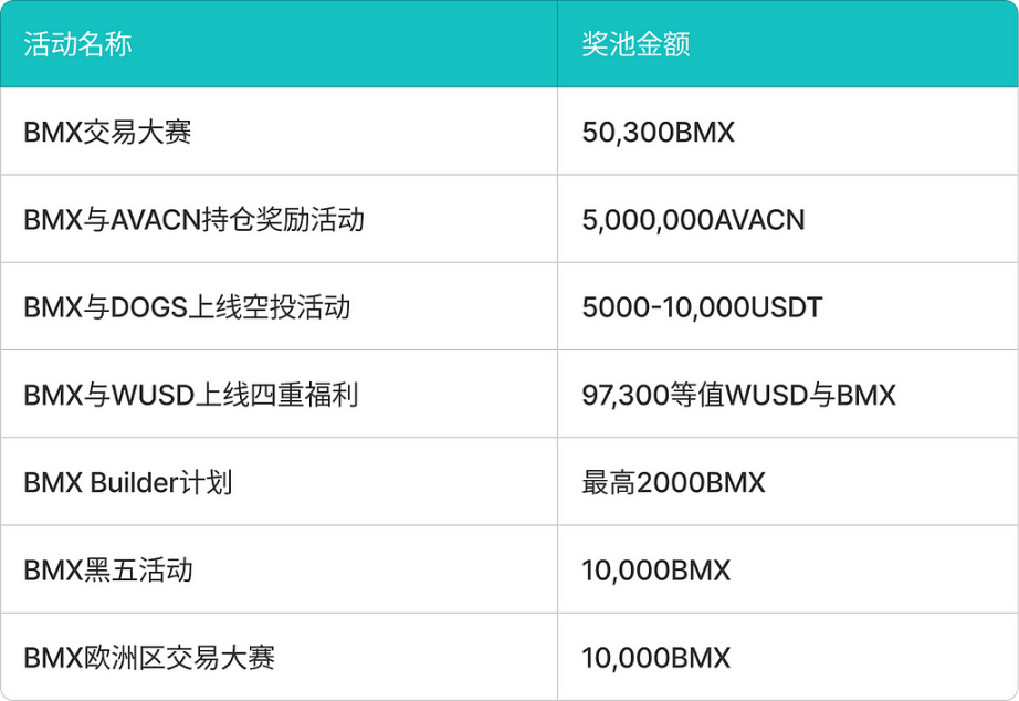 2024 年 BMX 推出了多项相关活动,进一步提升了其市场吸引力和用户参与度。其中主要包括了交易大赛、对外合作以及社区搭建等活动。交易大赛激励了大量用户参与交易,提升了 BMX 的流动性。对外合作在推广 BMX 的同时还提高了相关项目的知名度。BMX 社区建设计划,奖励活跃的社区成员并提供流量扶持。这些活动不仅增加了 BMX 的使用场景,也提升了其流通性和市场影响力。通过这一计划,BMX 不仅进一步增加了用户粘性,也为平台引入了更多忠实用户和社区建设者,提升了 BMX 的市场活跃度和长期发展潜力。