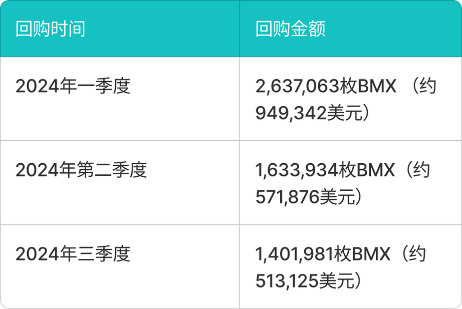 根据 BMX 白皮书中的回购机制规定,BitMart 在 2024 年共回购约 5,672,978 枚 BMX,总金额约 2,034,343 美元。这一系列回购计划体现了 BitMart 对平台币 BMX 的持续支持与信心。通过将交易手续费收入的一部分用于回购,BitMart 不仅有效减少了市场上的流通量,也提高了 BMX 的稳定性和稀缺性。