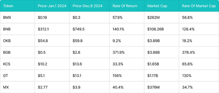 根据 CMC 和 CG 数据统计,过去一年主流交易所的平台币价格和市值均呈现上涨趋势,但表现分化明显。BMX 的价格涨幅 57.9%,市值涨幅 56.8%,总市值达到 2.62 亿美元,增长趋势稳健。总体来看,市值较低的币种受益于较小的基数实现快速增长,而高市值币种增长稳定,表现出较强的市场抗压能力,但增速趋于放缓。