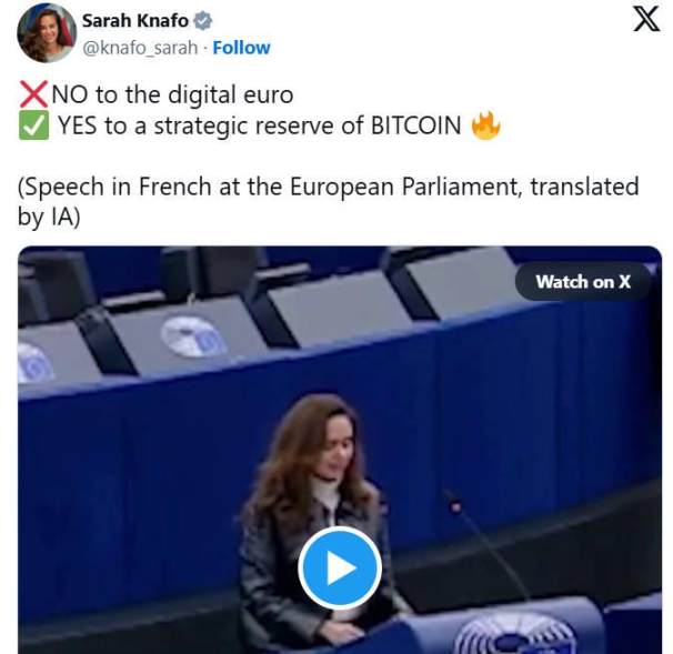 欧盟议员 Sarah Knafo 近日在布鲁塞尔提议建立比特币战略储备,称此举可效仿特朗普的政策,并警告数字欧元的推出可能导致「反乌托邦世界」。Markezic 表示,这一想法具有创新性,但在欧盟保守的金融环境中颇具争议。她认为,这一提案需要全面讨论,重点分析其潜在的收益与风险,尤其是比特币及其他加密资产的战略重要性,以及欧盟在全球竞争中的定位。