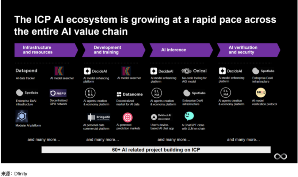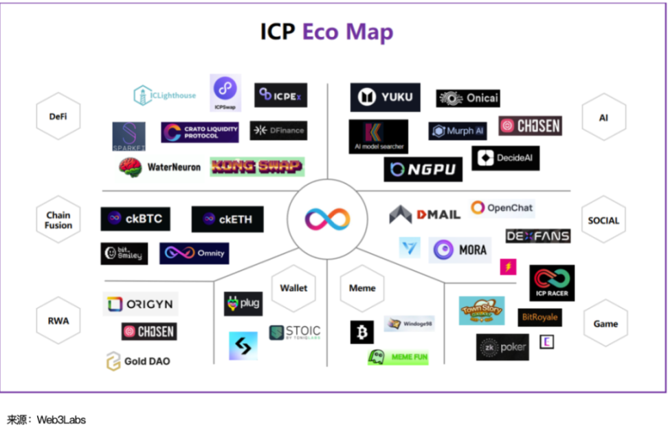 2.3.1 DecideAI(X:@DecideAI_)一家专注于创建基于 AI 的大型语言模型(LLM)的 Web3 公司,在 8 月底宣布已经通过 ICP 区块链完全部署了其 GPT-2 LLM,这一发展利用了 ICP 的能力来支持复杂的、计算密集型的应用程序,使得 Web3 开发人员能够构建、训练和改进专门的 LLM。未来,DecideAI 还将利用 ICP 的 Chain Fusion 技术(允许协议级区块链集成)将其 AI 模型扩展到以太坊和 Solana,在 8 月底宣布 AI 的完全链上化后,DecideAI 原生代币 DCD 在 9 月初的第一周内出现了几十倍的大幅增长,当前市值约 5000 万美元,拥有 20k+ 用户,2 个月内翻了近 4 倍。2.3.2 ELNA AI(X:@ELNA_DeAi)于 2023 年 8 月推出,是由社区驱动的去中心化 AI 代理创建平台,与其他 AI 聊天机器人由操作员选择训练数据不同,ELNA 的用户可以将自己的数据上传到网络,并训练专注于他们感兴趣的主题和应用程序的 AI 模型。完成后,ELNA 会将 AI 助手或 AI 代理部署到 ICP 区块链上,用户可以通过添加新数据不断扩展其 AI 知识。2.3.3 Chosen(X:@ProjectChosen)Project Chosen 是一个 AI 驱动的预测市场,此前曾是第一个基于 zkSync Era 的多模式预测市场,目前正部署在 ICP 网络上,通过 PeckShield 和 DeHacker 审计。Chosen 允许任何人通过预测、社交分享、投票等方式获得奖励和持续收入,同时,AI 在创建预测事件、成为预测的对手盘等方向,均有着较大的玩法创新的空间。2.3.4 MurphAI(X:@murphai_io)Murph AI 是一个基于 ICP 的 AI Hub,用户持有 ICP 及 ICP 的生态代币,即可使用各种类型 AI 的产品,同时,MurphAI 为 ICP 生态的 AI 产品提供包括算力、数据在内的一系列基建,打造 AI 技术堆栈。NGPU 是一个去中心化的人工智能计算网络,致力于为各种人工智能应用提供高性价比和稳定的 GPU 资源,通过基于任务的计费、智能资源分配和高效数据传输等创新功能,NGPU 可在人工智能驱动的服务中实现无权限访问、低延迟和高可靠性,NGPU 同时也是 ICP 的 AI 生态合作伙伴。2.3.6 MemeFun.ai(X:@memefunicp)Memefun.ai 是近期刚推出的一个新兴平台,定位为 ICP 上的 “Pumpfun”,它的目标是让每个人都能轻松创建和发布自己的 memecoin。MemeFun 不仅为创作者提供了一个发布创意和表达幽默的平台,也为用户参与 Web3 和加密货币文化提供了更加直观和互动的方式。当前,MemeFun 正在积极拓展在日本、韩国等亚太地区的社区,其更为创新的是使用 AI 作为 memecoin 的基建,如使用 AI 进行 memecoin 的创建、社区表情包的创建等,进一步降低 memecoin 的发行门槛。随着 Memecoin 热潮的持续,ICP 上的 Memecoin 有机会成为一种普世的金融与文化现象。SpotLabs 是一个 DeAI 平台,为企业提供一个简单的界面来管理安全基础设施,提供一套工具和一个不断扩展的插件生态系统(称为 “Spots”),这些 Spot 可以存储和人工智能驱动的加密公司数据,并且所有组织成员都可以访问,无论技术技能如何。在今年 3 月举办的首届 AI 黑客马拉松中获得第一名,并得到 ICP 1 万美元 grants。成立于 2024 年 1 月,平台涵盖了多个领域的标签,如 NFT、元宇宙、Gateaway、3D Avatar、AI、通缩机制(Deflation)、ICP 和多链(MultICPhain)。平台主要由三大核心模块构成:NFT、元宇宙和 AI Agent,Yuku 的元宇宙空间设计独具特色,用户可以无需钱包登录或注册,直接以游客身份进入体验,这一功能极大地降低了参与门槛,增强了用户体验的便捷性。2.3.9 Onicai(X:@onicaiHQ)Onicai 是一个 AI as a service 平台,为 ICP 生态项目提供更好的 AI 解决方案,其提供支持的 AI 产品包括如链上 AI 聊天工具 DeVinci、链上语言模型 ICGPT 等。Chain Fusion 目前支持 49 种协议,自 5 月份的 Tritium 升级以来,已集成了以太坊链和 EVM 链,链融合的具体应用包括:ICP 集成比特币主网:使得 ICP 成为了无需跨链桥机制的比特币 L2,ICP 网络运行比特币轻节点,并且其开发的门限 Schnorr 签名集成使得 ICP 智能合约能够从协议层面,签署比特币网络交易,例如铭刻铭文、蚀刻符文、交易 Ordinals NFT 等。Chain-Key Bitcoin(ckBTC)属于 ICP 链上特有的 DeFi 创新,是一种 ICP 链上的原生代币,可以看作比特币的“双胞胎”,于 2023 年 4 月发行,ckBTC 可以在 ICP 上实现快速、低费用、加密安全、完全链上的比特币交易,为 DeFi 和区块链空间带来真正的去中心化。ckBTC 的美妙之处在于它由真正的比特币 1:1 加密保护,并通过容器智能合约发行和赎回,任何人都可以随时验证,将 BTC 转换为 ckBTC 并返回的每一步都是去中心化的,这意味着没有集中的保管人、没有链桥,也没有可以充当攻击媒介的传统云提供商。用户向该智能合约发送真实的 BTC,可以铸造 ckBTC,反之,向智能合约发送 ckBTC,则智能合约会将 BTC 支付给用户的比特币钱包。ICP 集成以太坊主网:比特币整合不是链式融合的唯一受益者,以太坊还通过发布的 EVM RPC Canister 和引入链式密钥以太坊(ckETH)来欢迎这些功能,这是 ICP 上 ETH 代币的双胞胎。ICP 集成 Solana 网络:同上,Solana 集成预计 2024 年末支持。2.4.4 BifiPal(X:@BifiPal)BifiPal 致力于改变比特币的金融格局,通过利用 ICP 技术,将 BTC 实现无桥跨链至 ICP 上,同时 提供了全面的金融协议,旨在解决与比特币相关的流动性挑战和低回报问题,其目标是为比特币创建一个强大的金融系统,并逐步将传统金融服务引入比特币网络。2.4.5 TAP Protocol(X:@tap_protocol)TAP 是支持 OrdFi 的比特币 Ordinals 协议,旨在查找和跟踪 Ordinals,该协议引入了 TAP 代币标准,强调简单性和可访问性,它的关键机
