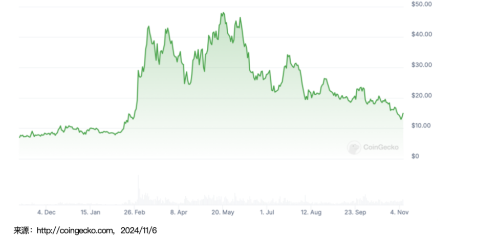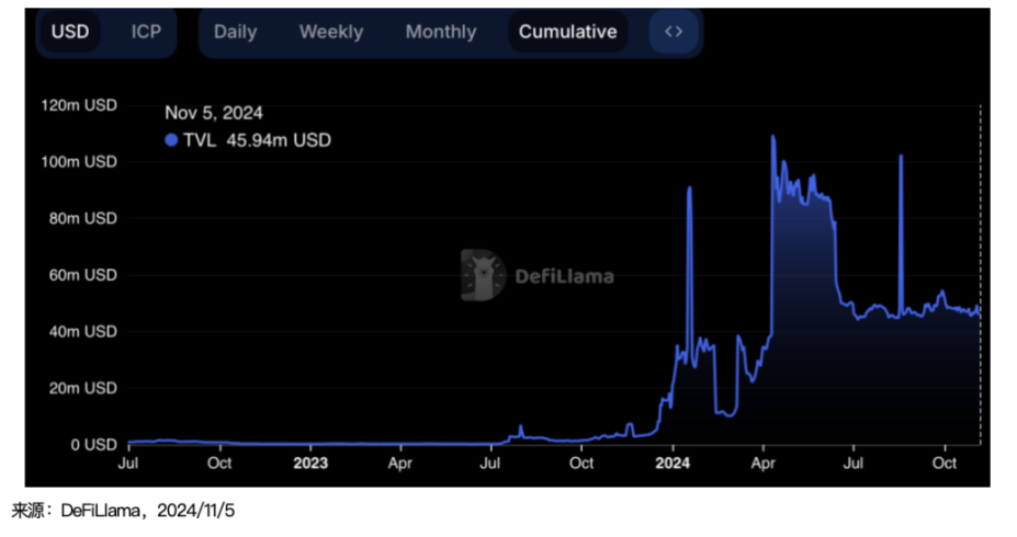 ICP 当前的 In-dApp TVL 为 5300 万美元,可以看到,进入 2024 年后,TVL 增长迅猛,已比年初翻了一倍。
