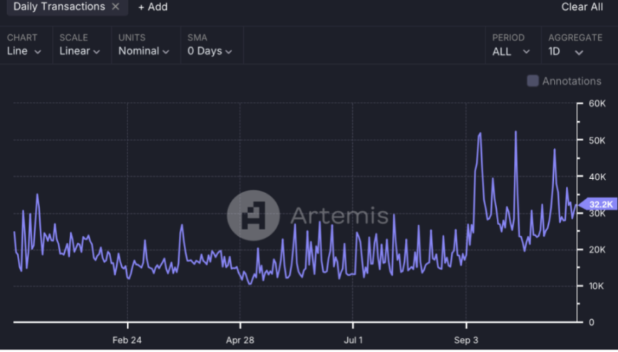 从每日交易笔数来看,进入 9 月后 ICP 上的交易量出现大幅提升,由以前的 15k 左右的水平翻了一倍到 30k 左右,且在 10 月 1 日创下历史交易新高(52.3k)。