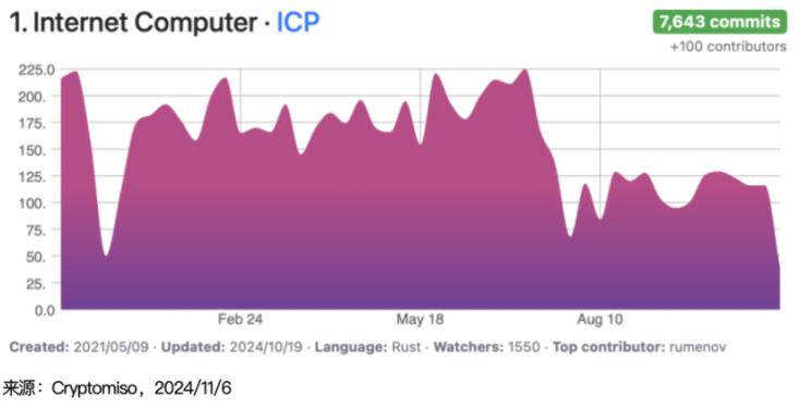 从 Github 提交数据来看,ICP 拥有最活跃的开发活动,以超过 7k 个提交(对项目源代码的修改)排在第一,这证明 ICP 在不断更新完善其项目。