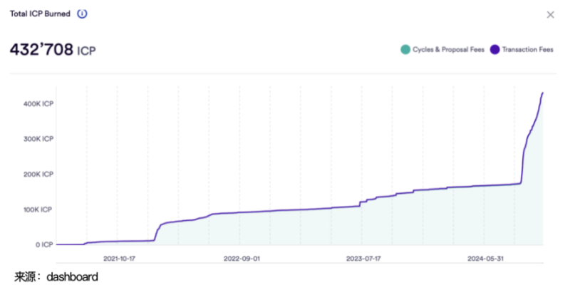此外,用户可能没有时间或知识参与所有投票决定,因此,神经元持有者可以选择将他们的投票委托给他们信任的其他神经元,而不是直接对提案进行投票,这种将投票权委托给其他选民的概念被称为流动民主。比较重要的一个环节是,质押 ICP 生成神经元时需要设置“溶解延迟”(Disslove Delay),类似于定期存款的年限,这个溶解延迟的时间是不可逆的,只能通过溶解的方式减少,到期之前无法提前取出,当质押者选择开启解锁时,神经元进入溶解状态,并将在事先设置的“溶解延迟”时间内完成溶解。“溶解延迟”可以增加神经元投票权重,最低需要半年才可以参与投票,当设置为 8 年时可以增加 1 倍选票,而正是 “8 年”的这一设定,诞生了 ICP 社区中 “8 Years Gang” 这一独特的社区文化,也能够看出 ICP 生态长期持有者的信念。下图显示了 ICP 的总消耗量,从主网上线至今,销毁的 ICP 数量为 432,471 个,包括以下三种消耗途径:- ICP 转账手续费:每次转账或批准交易的费用为 0.0001 ICP,截至目前,交易消耗的 ICP 为 1477 个。