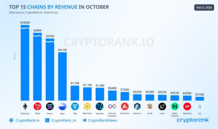 从收入水平来看,ICP 的 10 月收入位于前 8 大公链。