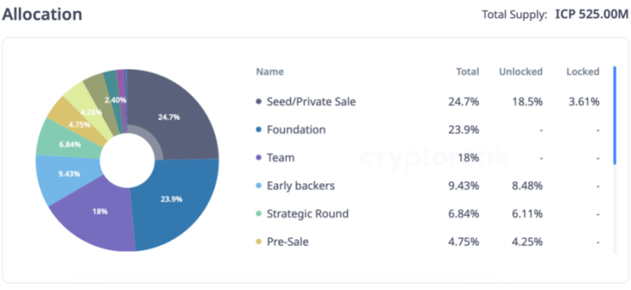 和许多 Token 经济模型不同的是,整个 ICP 网络由一种独特的经济模型平衡,ICP(原生代币) 没有一个总量上限,只有供应量的概念,供应量主要由流通供应和质押部分组成,而能够影响 ICP 实时供应的因素主要包括 ICP 的消耗和增发。截至 2024 年 11 月 22 日,ICP 的供应量为 5.25 亿,其中未解锁的部分为 38.4%。