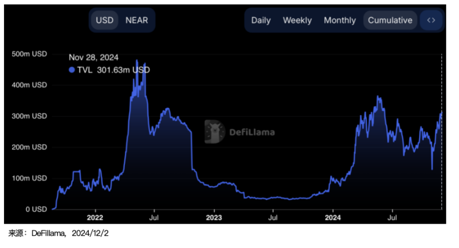 可以看到,Cyclotron 的推出,不仅让 ICP 在区块链领域独树一帜,更为未来 AI 与区块链的深度融合铺就了光明的道路,这也使得 ICP 成为了唯一能够在链上完整运行人脸识别的区块链,同时还能胜任图像分类和 GPT-2 推理等高阶 AI 用例(由 DecideAI 提供)。这不仅是技术上的飞跃,更是对区块链应用场景的一次重新定义,为未来链上 AI 的探索打开了一扇大门。ICP 的网络节点由符合特定要求的硬件机器组成,可支持数据存储和计算完全在区块链网络上实现,由去中心化的“链存储、链计算”彻底取代中心化的“云存储、云计算”,使得 ICP 是理想的 DePIN 基建网络。如果从 ICP 正在做的事情来看,它几乎找不到一个可以直接类比的竞争对手,因为它不仅仅是区块链,而是一个“互联网计算机”,能够承载从存储到计算的完整基础设施。这种架构打破了传统区块链项目的局限性,目标是成为一个无缝集成的开放式互联网服务平台,为开发者和用户提供超越 Web3 的体验。但如果我们回顾 2022 至 2024 年,会发现这是人类技术大幅加速的关键时期,尤其是 AI 发展出现了革命性的突破。我们生活在一个由中心化巨头,如 OpenAI、Google、Amazon 等主导的世界,这些公司拥有丰富的人才、硬件和资本,但中心化 AI 总是以利润最大化为目标,大科技公司对大语言模型的封闭性也阻碍了“AI 民主”的实现。在这种背景下,“开源 AI“、”Crypto AI” 等呼声开始越来越高,这就是为什么两个大型科技趋势(AI+ Crypto)的早期融合是如此引人注目,这正是奇迹发生的地方。ICP 并非专门的 Crypto AI,但它能够为 AI 模型和其它应用程序提供防篡改环境,通过开放和诚实的商业实践促进安全性和信任,容器是一种高性能智能合约,能够管理大量计算资源,从而能够非常快速有效地部署复杂的 AI 模型。DFINITY 的构想也是打造 AI 的去中心化未来,在这种理解上,我们主要将其与其他 AI 结合紧密的平台进行对比。在过去的十年中,区块链经历了三个演进阶段:比特币、以太坊与智能合约平台、致力于解决以太坊扩展性问题的第三代区块链,NEAR Protocol 正是第三代区块链的一个例子。 NEAR 成立于 2018 年,于 2020 年 10 月在主网上线,在 2022 年一年获得了 5 亿美元融资,投资方包括 A16Z Crypto、Tiger Global 等知名机构。作为一个基于 PoS 的 L1,NEAR 决定构建一个具有不同架构的全新区块链来解决扩容问题:它摆脱了参与网络的每个节点都必须运行所有代码的想法,使用了分片技术(Nightshade,区块链横向扩容的方式之一)。如果把区块链比作一条高速公路,分片技术可以将这条公路加宽并划分为多行道进行分流,Nightshade 将处理交易的工作分散到众多验证节点,一个验证节点只需要处理网络交易的一小部分,这样一来,节点就能跨越多个分片并行处理和验证交易,从而增加每秒交易量,进而从整体提高网络的可扩展性。NEAR 当前以 68.48 tx/s 的 TPS 在所有公链中排名第 6(ICP 以近 5k tx/s 排名第一)。根据 DeFiLlama,NEAR 当前的 In-dApp TVL 为 3 亿美元,其中 Burrow 以 2.2 亿美元占据了 73%,Burrow 是一个去中心化、非托管、基于资产池的借贷平台,在性质上与 Aave、Compound 和其他基于池的协议相似。下图中 2022 年 4 月初出现的近乎垂直的 TVL 爆发增长,正是因为 Burrow 在 NEAR 主网的上线。