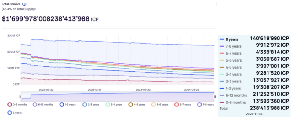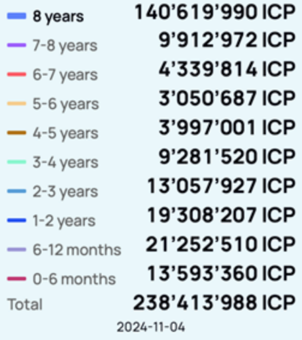 - 一是神经元的溶解释放,根据 ICP Dashboard 中数据显示,质押的 ICP 总数为 238M(约 26.5 亿美元),其中 85% ICP 处于非溶解状态,15% 处于溶解状态,从“溶解延迟”年数来看,59% 为 8 年期,锁定价值高达 10 亿美元,这足以使 ICP 网络进入 TVL 前十大公链生态行列,目前 DeFiLlama 的计算中并未考虑到这一点,其次为半年至 1 年期,占比为 9%。