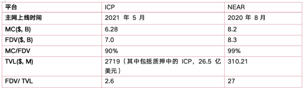 对于 ICP 的估值是个难题,因为它做的不仅是一个区块链,而是想将整个 web2 世界在 web3 重构,从其未来的规划及构想来去衡量这个平台,价值是无限的,但我们也需要考虑,在关键时间点上,ICP 与其 20 年路线图规划上的差距和实现情况。以下展示了 ICP 和 NEAR 的一个对比,自 2021 年的价格被第三方操作的事件以来,ICP 的币价一直运行在低位,因此市值角度来看不算亮眼,但依然稳居 CoinMarketCap 上前 30。此外,ICP 的生态在持续不断建设和完善中,这一点我们在后面有单独的分析,尤其是其创始人已经表达了对 AI 区块链化的强烈兴趣和倾斜,这一块未来将解锁的价值是巨大的。