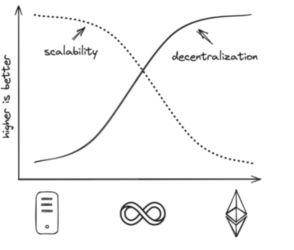 此外,完全基于 ICP 的去中心化社区 OpenChat 上,也有 25.71k 的 MAU(月活跃用户数),这些用户将享受彻底的去中心化的社区产品。ICP 的开发始于 2019 年 Copper 的发布,它引入了软件开发工具包(SDK)和 Motoko - 一种专门为编写智能合约而设计的编程语言,ICP 上的智能合约最大的优势是:既具有传统应用程序的表达性和可扩展性,又能从区块链的去中心化和去信任的执行中受益。从以下的概念图中可以看出,从中心化的服务器到以太坊 - 去中心化程度在逐渐增加,但这是以可扩展性为代价的,ICP 位于曲线中间,致力于寻求可扩展性和去中心化之间的平衡。