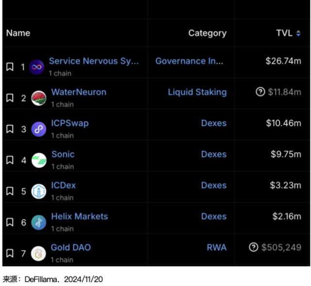 从 TVL 构成来看,目前被 DefiLlama 记录的 ICP 有 TVL 的 dApp 有 10 个,其中的 6 个是有比较 solid 的 TVL,6 个中有 1 个为 ICP 自己的 SNS DAO,其余 5 个为 WaterNeureon、ICPSwap、Sonic、ICDex 和 Helix Markets。